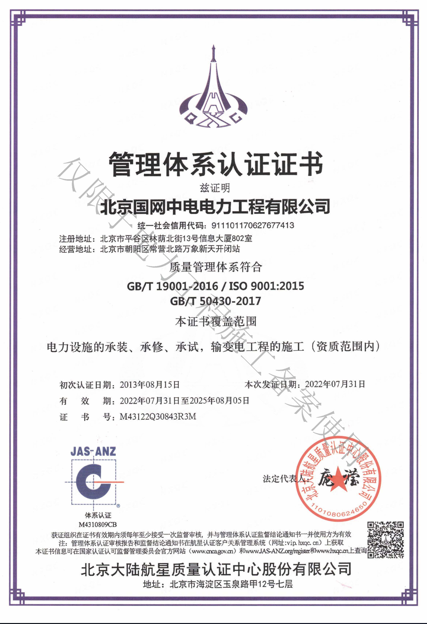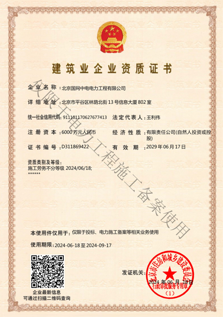 北京國網(wǎng)中電電力工程有限公司,已取得國家電監(jiān)會頒發(fā)的《承裝(修、試)電力設施許可證》、為電力施工承裝四級、承修四級、承試四級企業(yè)。北京市住房和城鄉(xiāng)建設委員會頒發(fā)的房屋建筑施工總承包二級、機電設備安裝工程專業(yè)承包二級、輸變電專業(yè)承包二級、城市及道路照明工程專業(yè)承包二級、市政公用工程總承包二級資質、勞務不分等級,已通過ISO9001:2015 GB/T50430-2017質量管理體系、GB/T24001-2016/ISO 14001:2015環(huán)境管理體系、